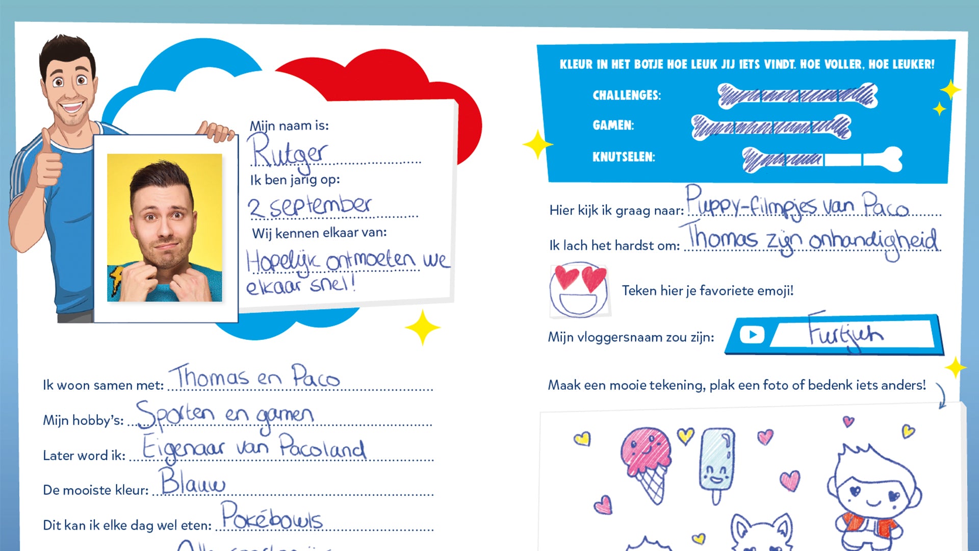 Word ook vrienden met Rutger, Thomas & Paco! Dit vriendenboek is al ingevuld door Rutger, Thomas & Paco en heeft nog plek voor al jouw andere vrienden, vriendinnen, klasgenoten en familie!